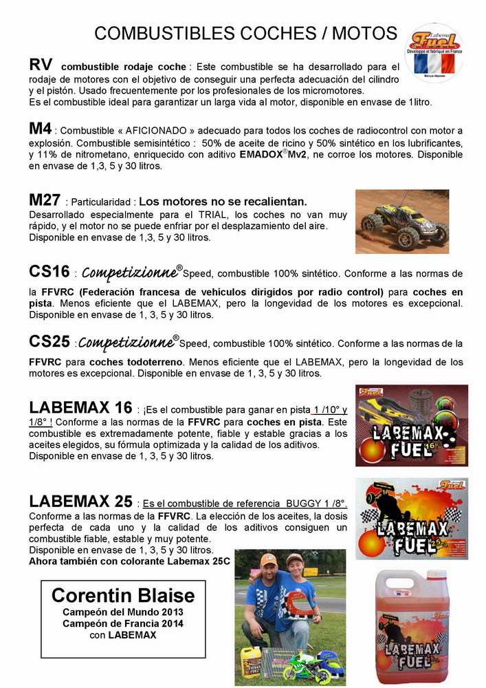 CS16 : Competizionne®Speed, combustible 100% sintético. Conforme a las normas de la FFVRC (Federación francesa de vehículos dirigidos por radio control) para coches en pista. Menos eficiente que el LABEMAX, pero la longevidad de los motores es excepcional. Disponible en envase de 1, 3, 5 y 30 litros.