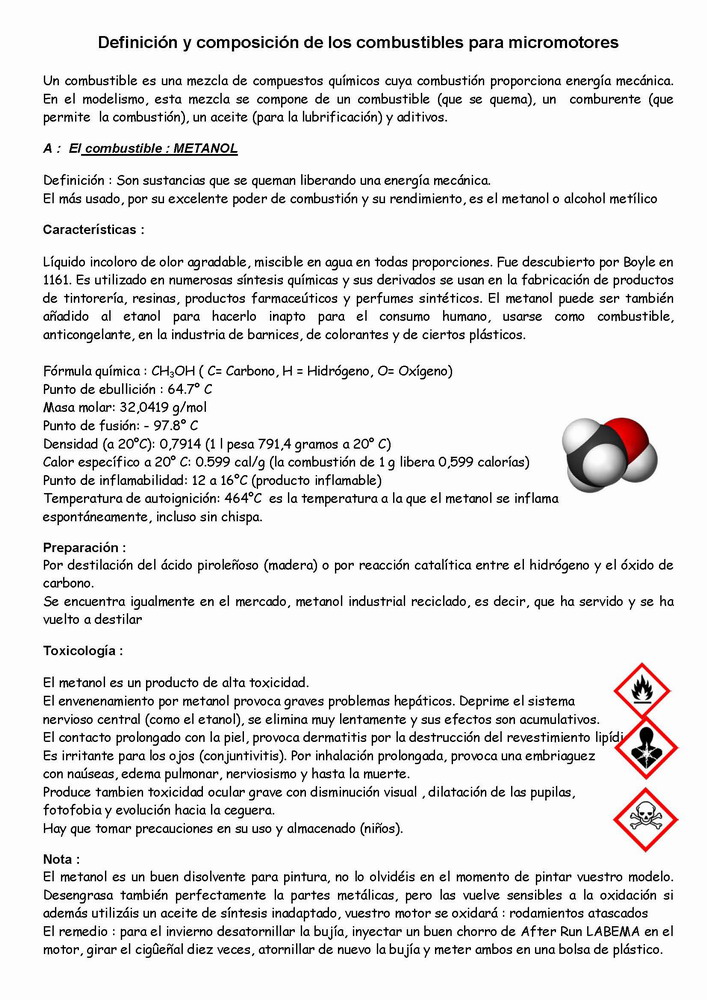 Un combustible es una mezcla de compuestos químicos cuya combustión proporciona energía mecánica. En el modelismo, esta mezcla se compone de un combustible (que se quema), un  comburente (que permite  la combustión), un aceite (para la lubrificación) y aditivos.